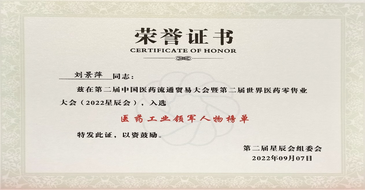 本次星辰会期间,利来w66斩获颇丰,获得多项行业奖项及荣誉。在开幕式上,刘景萍董事长荣获“医药工业领军人物”称号。